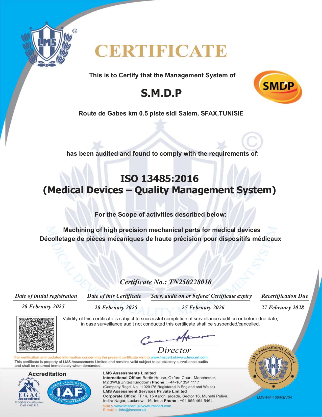 SMDP est certifiée ISO13485 : 2016
